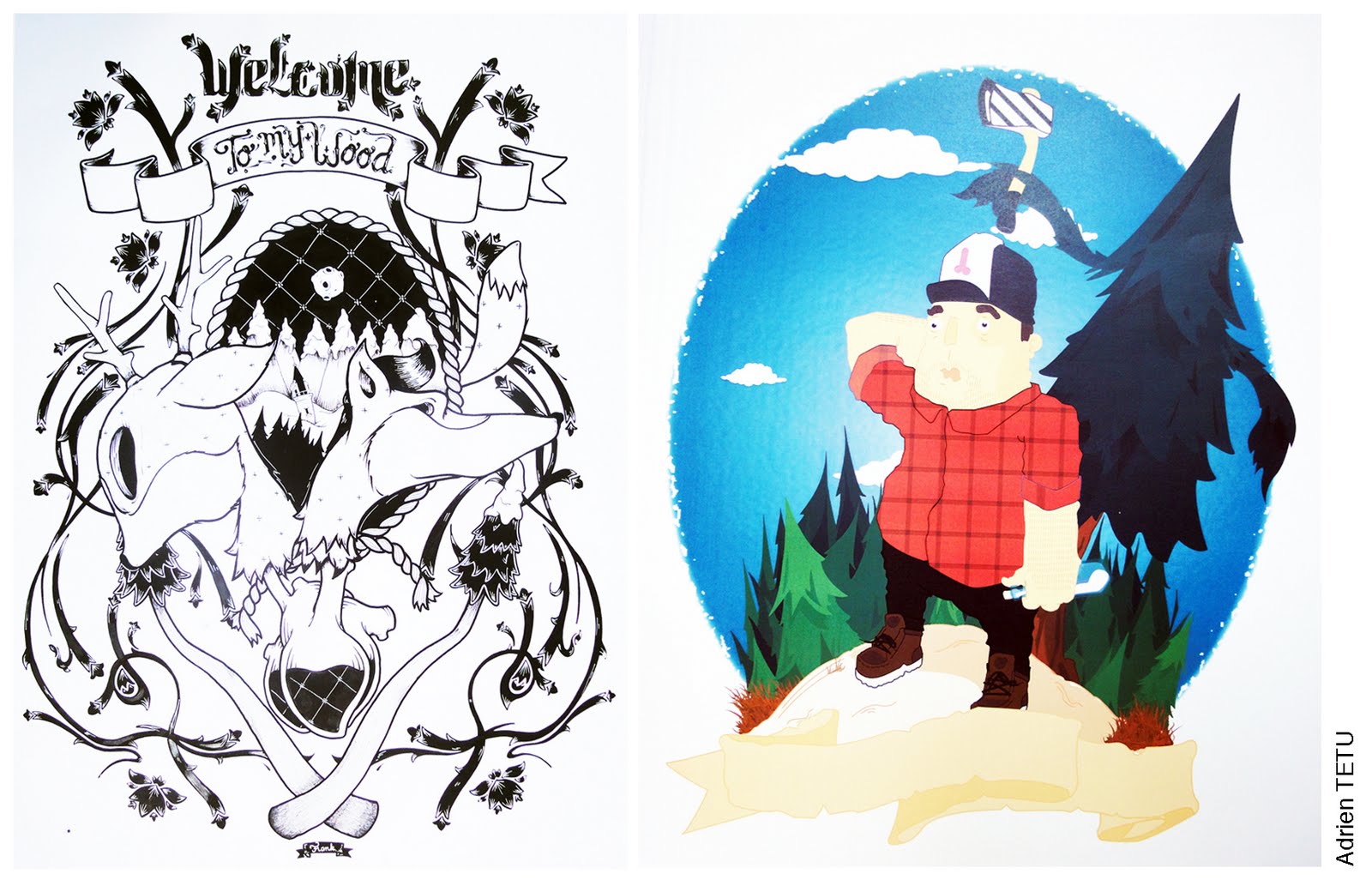 Croyez le si vous le voulez, mais nous sommes toujours sur le thème des floralies. Notre illustrateur maison Adrien est parti comme un dard, (ou devrais-je dire comme une flèche?) avec un très beau projet concret, un peu long à expliquer ici, mais qui devait le sortir de ses petites habitudes. Mais voilà, parti tout feu, tout flamme, on dirait qu'il s'est perdu en route pour n'arriver nulle part. C'est d'autant plus dommage que ces deux illustrations (sans rapport apparent) sont loin d'être inintéressantes, raison pour laquelle j'affiche ce travail. Il ne suffit pas de faire de belles choses, encore faut-il qu'elles répondent à une problématique. Mais bon, comme je le dis souvent, c'est en se plantant qu'on grandit et qu'on apprend. Et vous, qu'en dites-vous?